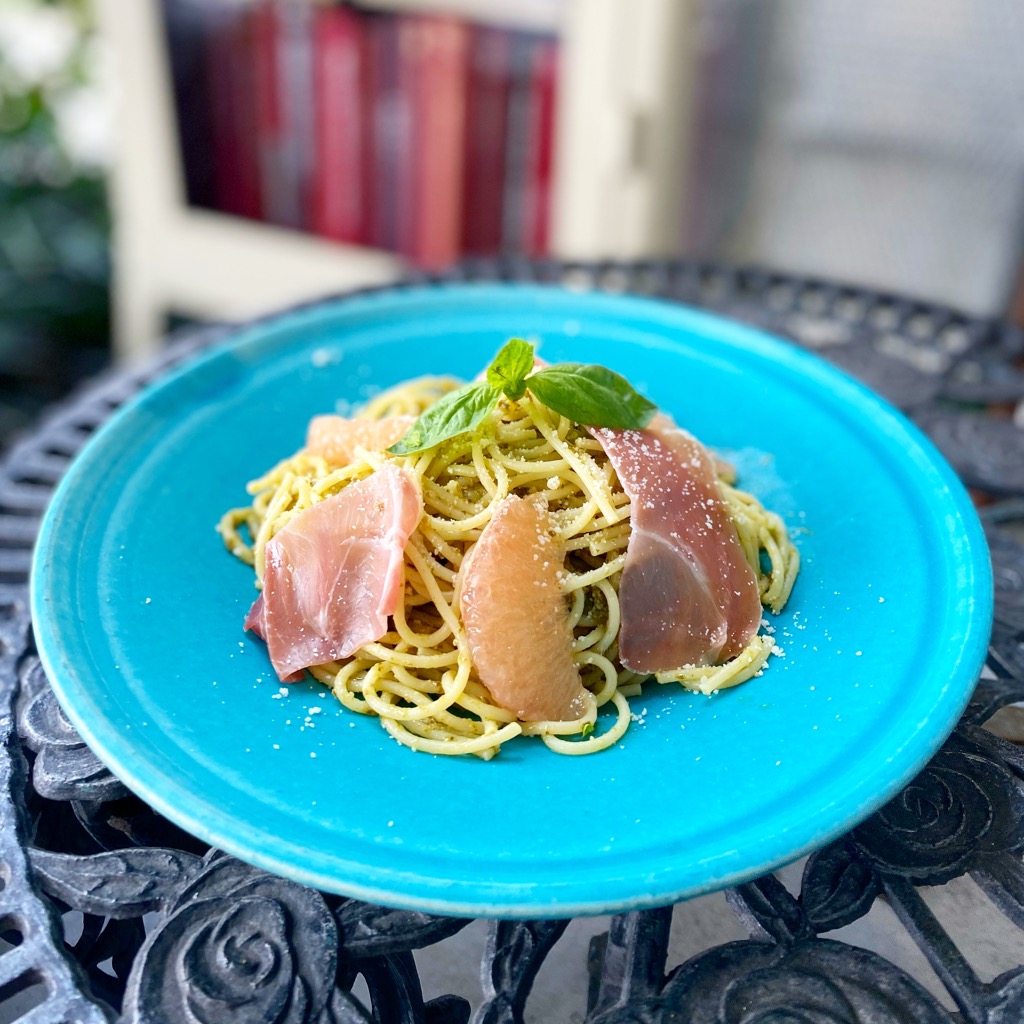生ハムの塩味とピンクグレープフルーツの甘酸っぱさ、爽やかなバジル香るジェノベーゼのコントラスト。